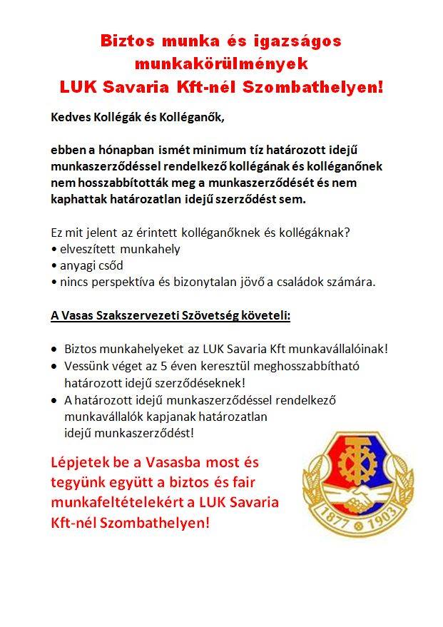 Az LUK szombathelyi gyárában sok munkavállalóval öt évre szerződnek, de úgy, hogy a szerződéseket három-hat havonta meghosszabbítják. Ez törvényes, de mégis a joggal való visszaélés, hiszen a törvény azt írja, hogy csak objektív gazdasági érdek miatt lehet határozott idejű szerződést kötni. Erre kívánta felhívni a figyelmet a Vasas, a tegnapi akciójával.