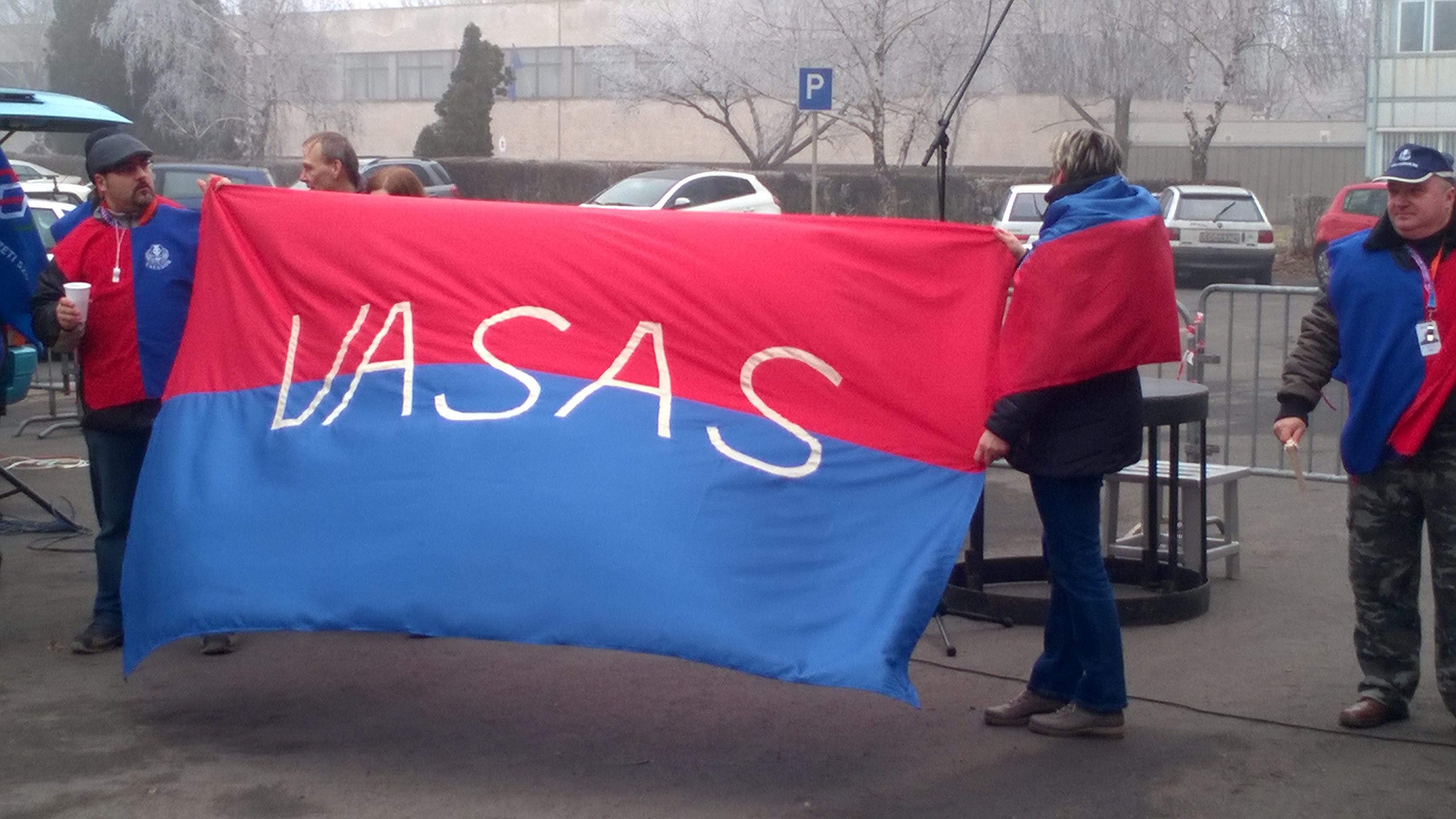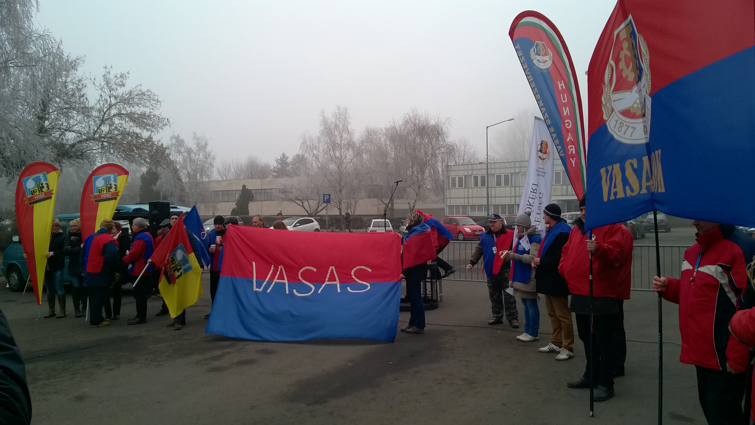 A Dunaferr DV. Vasas Szakszervezet által meghirdetett mai demonstráción munkavállalók, szakszervezeti tagok és támogató szervezetek képviselői vettek részt. Sokan voltunk, de lehettünk volna többen is. Sajnos azonban a munkáltató különböző módokon, például fenyegetésekkel gátolta a kollégák részvételét. Miről szólt a tüntetés? A középtávú bérmegállapodás szerinti 1,7 százalékos alapbéremelésnél magasabb bérnövekedést követeltek a dolgozók. A társaság székháza előtt tartott tüntetésen Mucsi Zoltán, a szövetség elnöke megszégyenítőnek nevezte az 1,7 százalékos béremelést. Megjegyezte, hogy követelésük fedezete a kormány által a munkáltató számára a szociális hozzájárulási járulék 5 százalékos csökkentéséből adódó mintegy egymilliárd forint, amiből a cégvezetés "egyetlen fillért" sem akar a munkavállalóknak adni, sőt érdemben tárgyalni sem akar. Balogh Béla a Vasas Szakszervezeti Szövetség elnöke szerint pedig nagyobb megbecsülés illetné a nehéz fizikai munkát végző dunaferres dolgozókat. Mezei Zsolt, a kokszolómű szakszervezeti bizottságának elnökhelyettese emlékeztetett arra, hogy a dolgozók korábban többször lemondtak már bizonyos juttatásokról, hogy a vállalat a nehéz helyzetben pénzhez jusson, most elvárják, hogy amikor lehetőség van rá, több pénzt kapjanak. A beszédek közben "Nem félünk!" és "Bért akarunk!" kiabálták a tüntetők és gyakran fújták a sípjaikat, valamint felharsantak a kereplők is.
