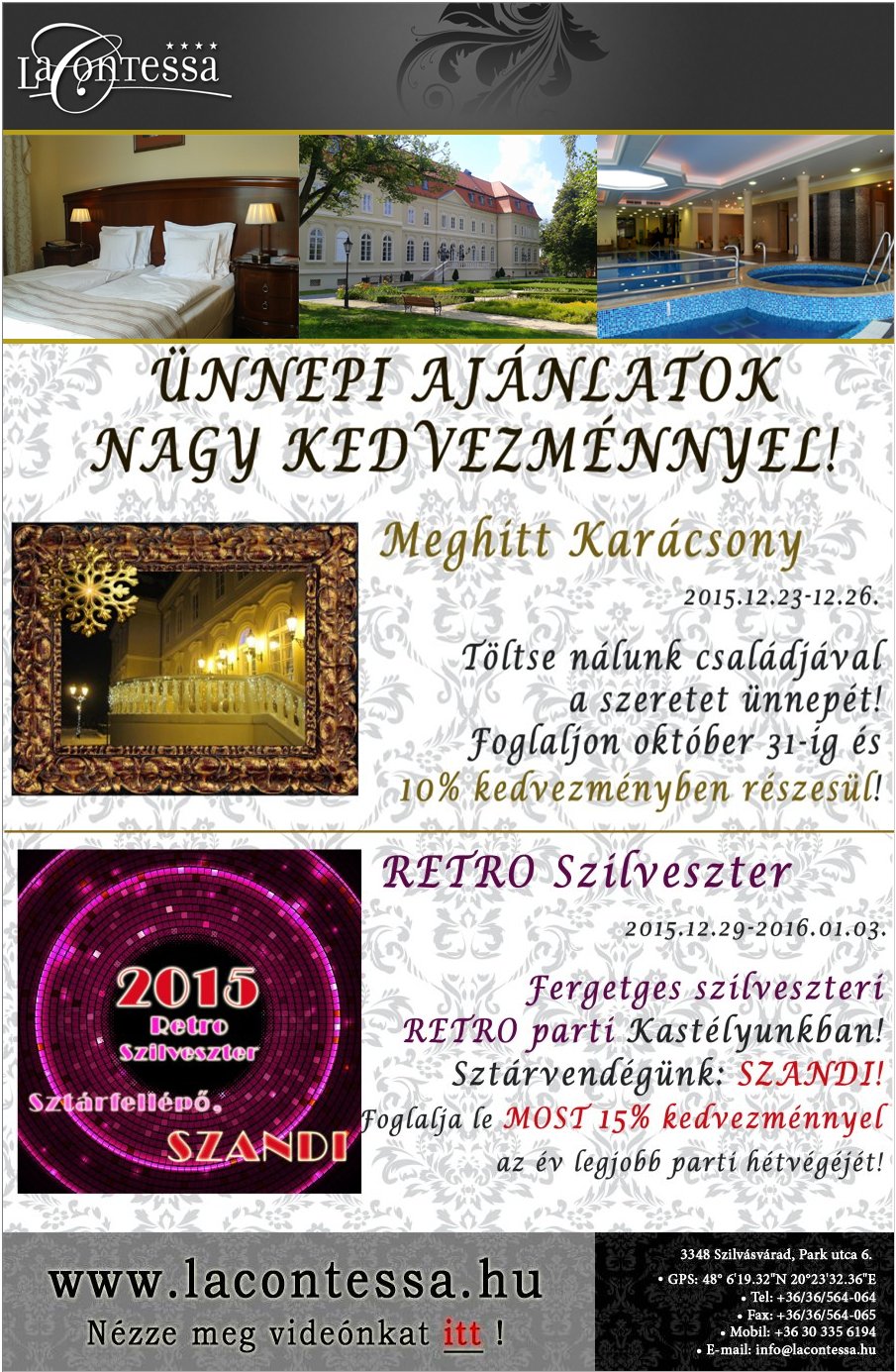 A szilvásváradi La Contessa Kastélyhotel (www.lacontessa.hu) eljuttatta hozzánk az év végi ünnepekre szóló kedvezményes ajánlatát tagjaink részére. Az ünnepi programokról, és a kedvezmény mértékéről bővebben itt olvashattok.