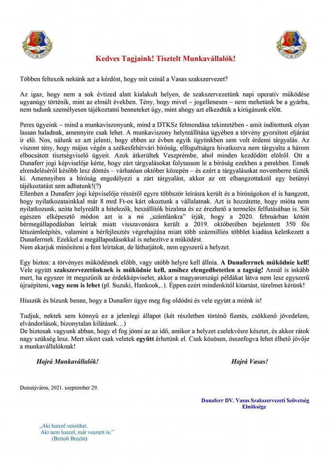 A Dunaferr DV. Vasas Szakszervezeti Szövetség elnöksége a héten tájékoztatást adott tagjainak a saját helyzetéről és a pereik állásáról, további kitartást és támogatást kérve és remélve tagjaiktól. A tájékoztató ITT olvasható.