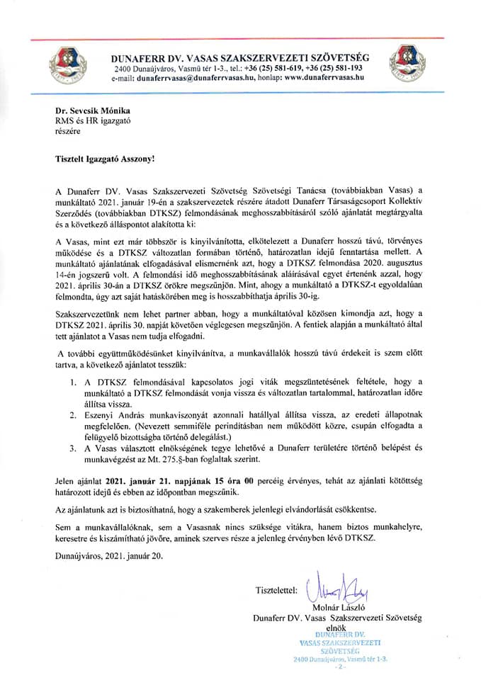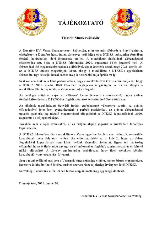 Ahogy arról tegnap beszámoltunk a szakszervezetek és a munkavállalók is levelet kaptak a Dunaferr "vezetőitől" arra vonatkozóan, hogy meghosszabbítanák a DTKSz. megszűnésének időpontját 2021. április 30-ig, amennyiben a szakszervezetek képviselői ma 15 óráig aláírják az erről szóló dokumentumot. Erre az ITT olvasható levélben reagált  a Dunaferr DV. Vasas Szakszervezeti Szövetség, és kiadott egy munkavállalói tájékoztatót is, amely ITT olvasható.