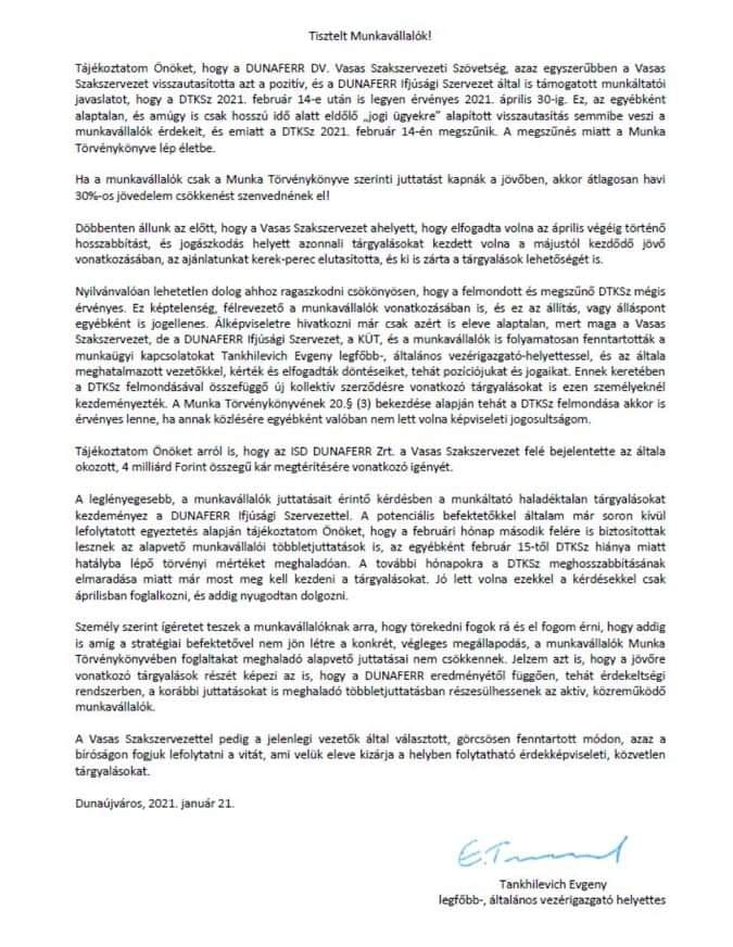 A helyzet feszült és egyre fokozódik a Dunaferrben. Ennek ékes bizonyítéka az a levél, melyet tegnap kaptak a munkavállalók és a szakszervezetek a munkáltatótól. Evgeny Tankhilevich munkavállalóknak írt levele ITT olvasható.