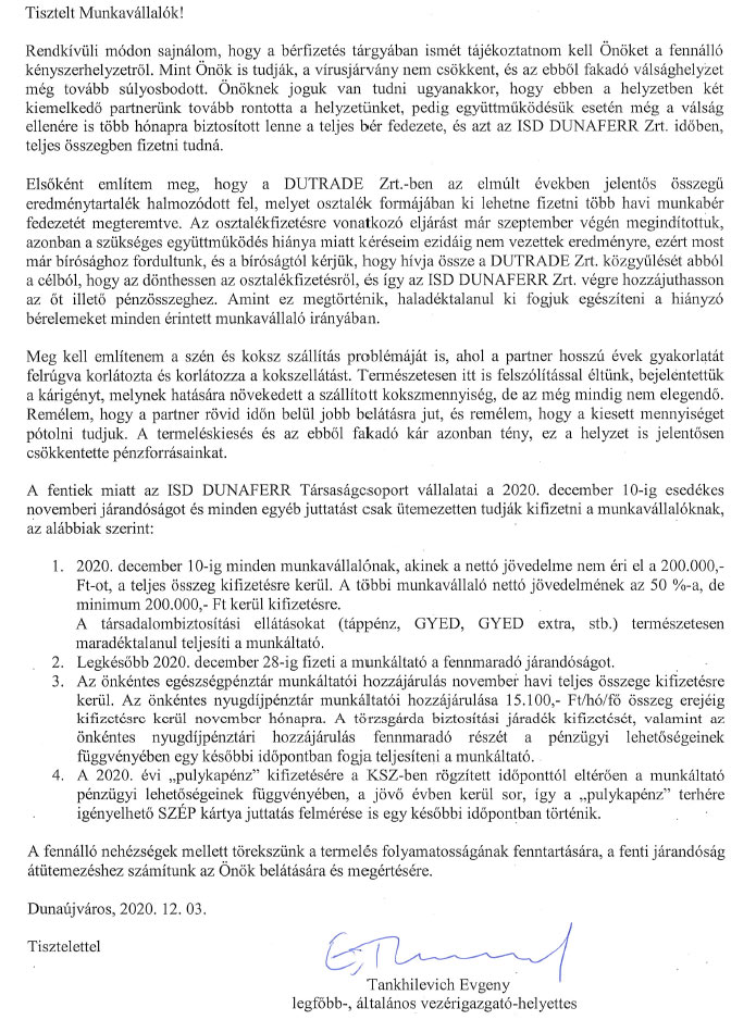 A Dunaferrben tegnap két elkeserítő vagy inkább felháborító esemény is történt. Az egyik, hogy a "szokásoknak megfelelően" ismét levelet kaptak a munkavállalók Evgeny Tankhilevichtől, melyben sajnálattal értesíti a dolgozókat, hogy a novemberi bérük is két részletben kerül kifizetésre. Ráadásul karásony előtt, december 10.-ig csak a bérük fele érkezik a számlájukra és a második kifizetés december 28.-ra várható. A decemberben esedékes "pulykapénz" kifizetése pedig valamikor a jövő év folyamán, talán... A másik elképesztő esemény pedig az volt, hogy az aznapra összehívott ISD Dunaferr Zrt. közgyűlése a többségi részvénytulajdonos képviselőjének távolmaradása miatt határozatképtelen volt. A megjelent kisebbségi részvénytulajdonosok képviselőit a biztonsági szolgálat munkatársai - utasításra - nem engedték be a közgyűlési terem épületébe sem.Az ISD Dunaferr Zrt. ügyvédi irodájának vezetője és a közgyűlést összehívó Igazgatósági tag teljes felhatalmazásával bíró ügyvéd konzultációt folytattak, amiről azonban nincs további információ.