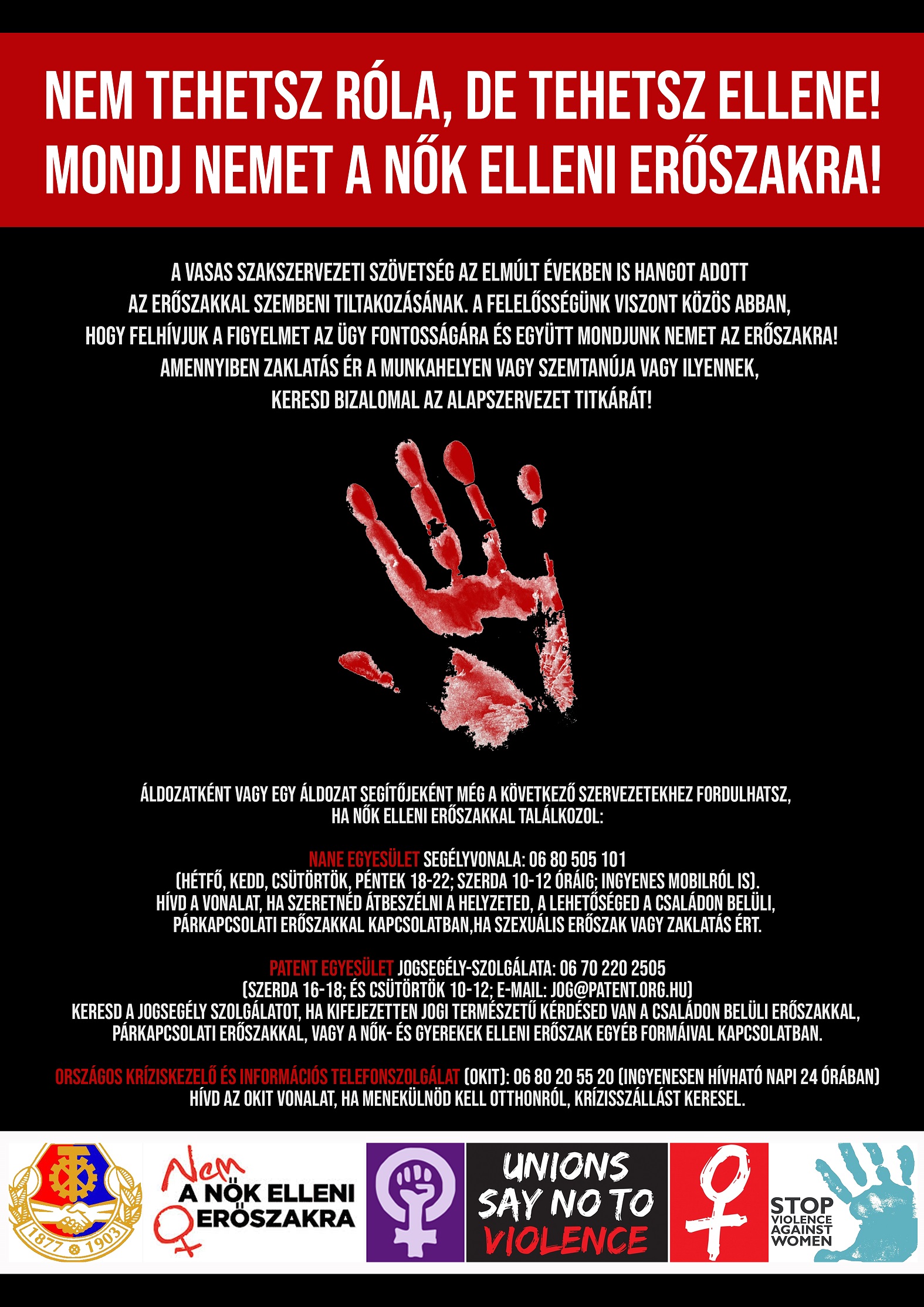 Ma, november 25.-én van a nők elleni erőszak felszámolásának világnapja. A Vasas a múlt héten indította el kampányát, melyben igyekszik felkelteni a téma iránti figyelmet, és egyértelműen állást foglal a nők elleni erőszakkal szemben. A zaklatás bármely formája esetében zéró toleranciát hirdetünk. Jó példával járunk elöl, és elkötelezettek vagyunk, hiszen egy ügy is túlságosan sok. A nemi alapú erőszak és a kapcsolati erőszak áldozatai különösen kiszolgáltatott helyzetben vannak. Kötelességünk melléjük állni, az áldozatoknak joguk van a védelemhez, az elkövetőket pedig számon kell kérni tetteikért. Nem maradhatunk csendben, nem fordíthatjuk el a fejünket, nem lehetünk közömbösek! .. mert vétkesek közt cinkos aki néma (Babits Mihály)