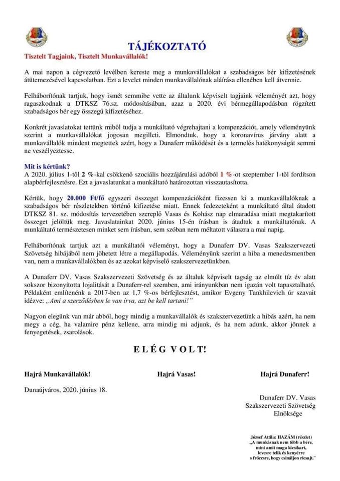 Ismét feszült a helyzet a Dunaferrben. A munkáltató, mivel nem tudott megállapodni a szakszervezetekkel, újra direkt a munkavállalókhoz fordult. A cégvezető levelében a nehéz gazdasági helyzetre hivatkozva közölte, hogy a július 10.-ig fizetendő "szabadságos bért" csak részletekben tudja kifizetni. A kialakult helyzetért pedig a Vasas helyi szervezetét okolja. A Dunaferr DV. Vasas Szakszervezeti Szövetség elöksége pedig tájékoztatót adott ki a valós helyzetet és annak okait feltárva. "Nagyon elegünk van már abból, hogy mindig a munkavállalók és a szakszervezetünk a hibás azért, ha nem megy a cég, ha valamire pénz kellene, arra mindig mi adjunk, és ha nem adunk, akkor jönnek a fenyegetések, zsarolások. ELÉG VOLT!" - írják az érdekvédők. A munkavállalókat képviselő helyi Vasas szakszervezet jogi lépéseket fontolgat, amennyiben a munkáltató nem teljesíti a megállapodásban vállalt kötelezettségét.