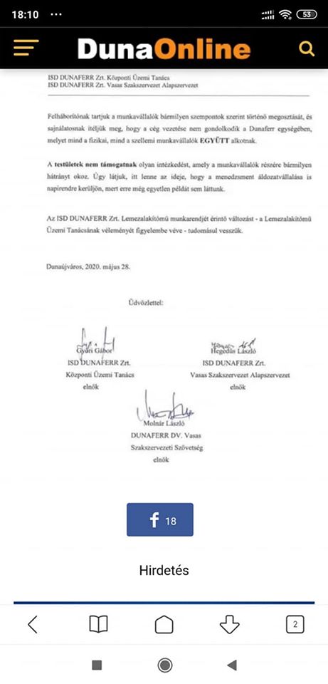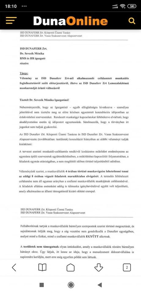A Dunaferrben továbbra sem sikerült megtartani a munkáltató és az érdekvédelmi szervezetek találkozóját, mivel előbbi nem adott olyan időpontot, amikor részt tudna venni a konzultáción. Emlékeztetőül: A Dunaferr cégvezetése három anyagot terjesztett elő, amelyekben a kialakult nehéz gazdasági helyzet kezelésére illetve a DTKSZ módosítására tett javaslatot. Ezzel kapcsolatban egyeztető tárgyalásra hívta az érintett érdekképviseleteket, melyen végül a meghívó fél nem jelent meg. Másik időpont mideddig nem került kijelölésre, így a helyi Vasasok és a Központi Üzemi Tanács levélben fogalmazta meg az álláspontját, amit a tegnapi napon elküldött Dr. Sevcsik Mónika RMS és HR igazgató részére. A levél ITT és ITT olvasható.