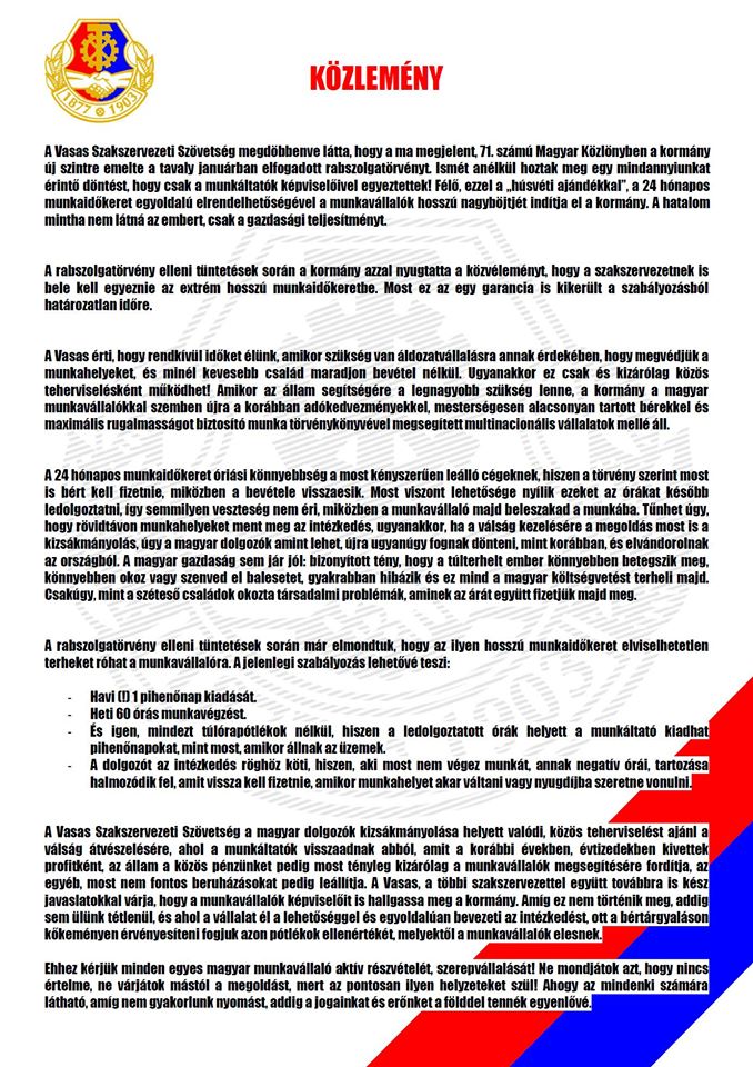 A Vasas Szakszervezeti Szövetség megdöbbenve látta, hogy a ma megjelent, 71. számú Magyar Közlönyben a kormány új szintre emelte a tavaly januárban elfogadott rabszolgatörvényt. A közlemény folytatása...