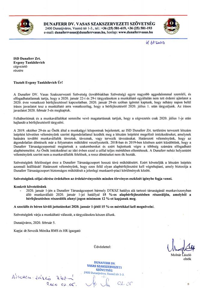 A Dunaferr DV. Vasas Szakszervezeti Szövetség levélben megküldte a munkáltató részére, a bértárgyalással kapcsolatos aggodalmait és követeléseit. Ezt követően levelet írtak a munkavállalóknak is, amiben reagáltak Evgeny Tankhilevich cégvezető a dolgozókat félrevezető soraira. Az írásban felrótták a menedzsmentnek, hogy "... a munkavállalók igényeit tartalmazó leveleinket, amelyeket átadunk a menedzsmentnek, azokat a szakszervezetünk vezetőinek egyéni véleményének és követelésének minősíti." A szakszervezet határozott álláspontja, hogy a Dunaferr megbecsült, hosszú távú jövőképpel felvértezett munkavállalók nélkül nem lesz működőképes és nyereséges sem, ezért minden törvényes eszközzel fellépnek a Dunaferr munkavállalóinak érdekében, a gyár jövőjéért. Ennek a holnapi tiltakozó demonstrációval adnak nyomatékot, melyet az Orosz Föderáció nagykövetsége elé szerveznek szerdán délután fél öttől. A szolidaritás jegyében legyünk minél többen! Mi ott leszünk! Hajrá Dunaferr VASAS!