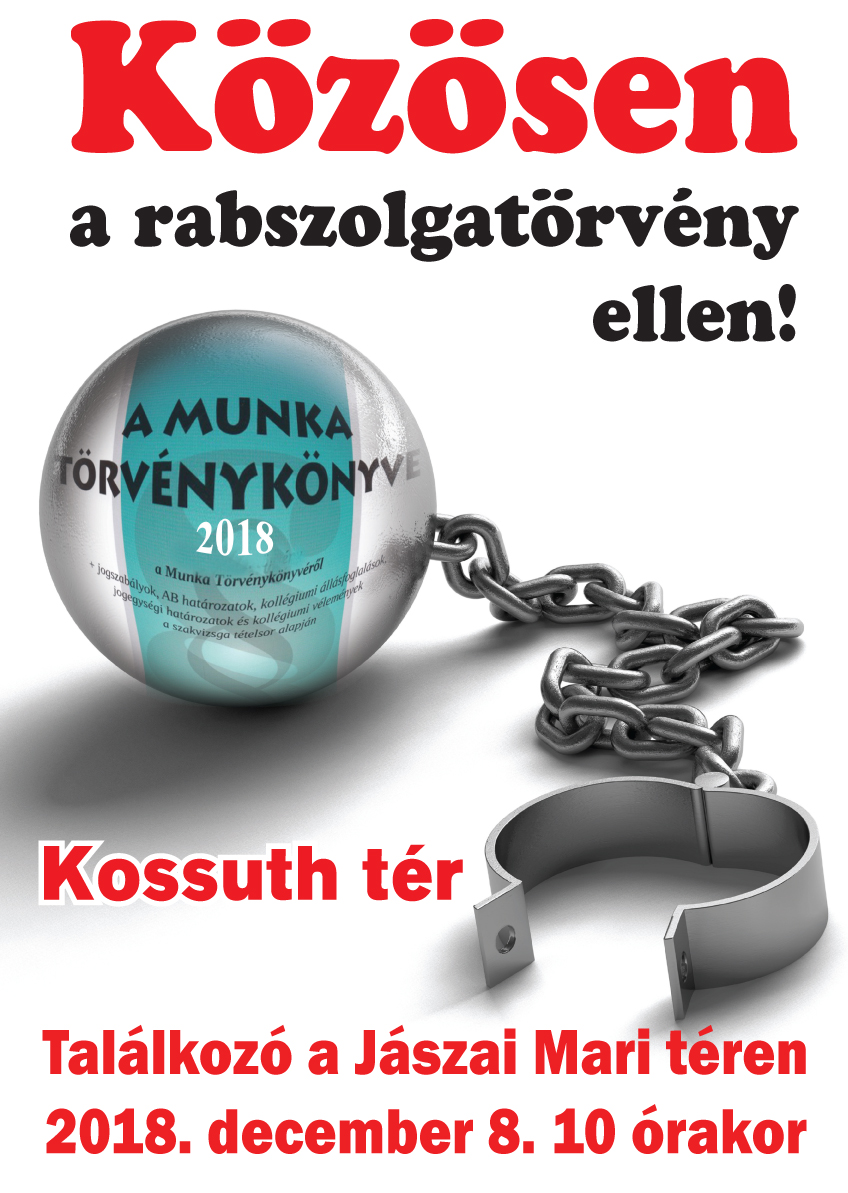 Gépkocsis forgalomlassítással tiltakozunk a rabszolgatörvény elfogadása ellen! Találkozzunk 2018. december 11-én 8:45 órakor Szolnok külterületén a 32. sz. főközlekedési út 67 km 750 szelvényénél Szolnok irányába! A rendezvényt a Magyar Szakszervezeti Szövetség és a Vasas Szakszervezeti Szövetség nevében Kováts Béla szervezi.