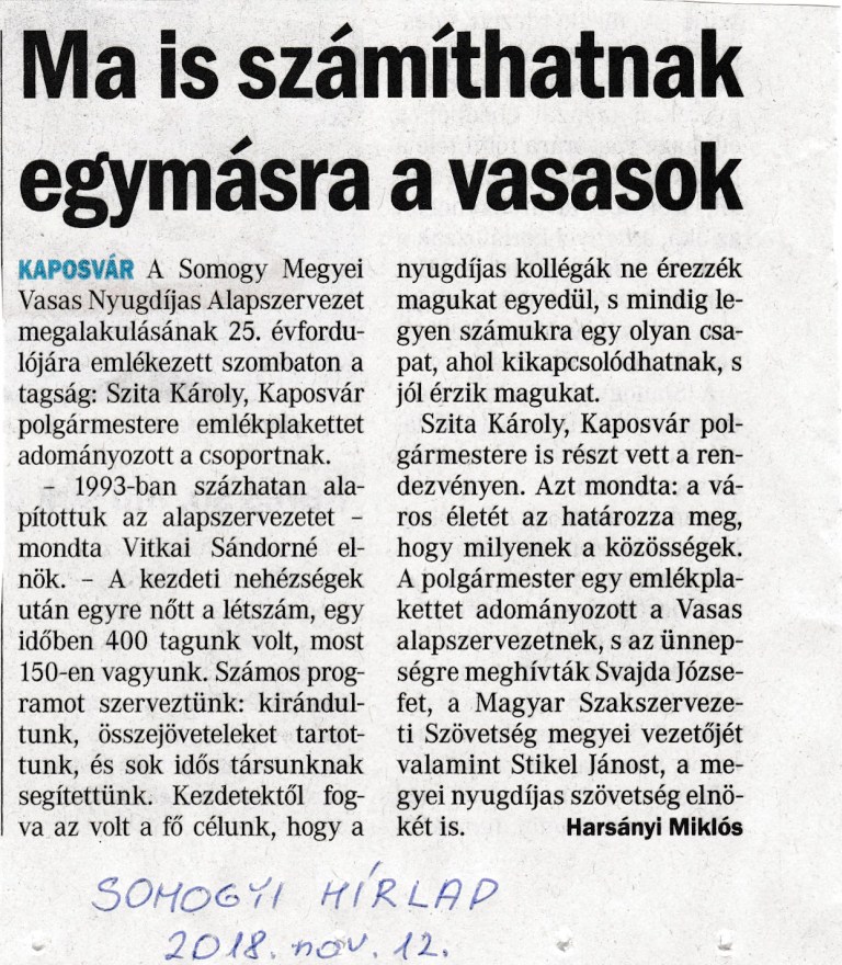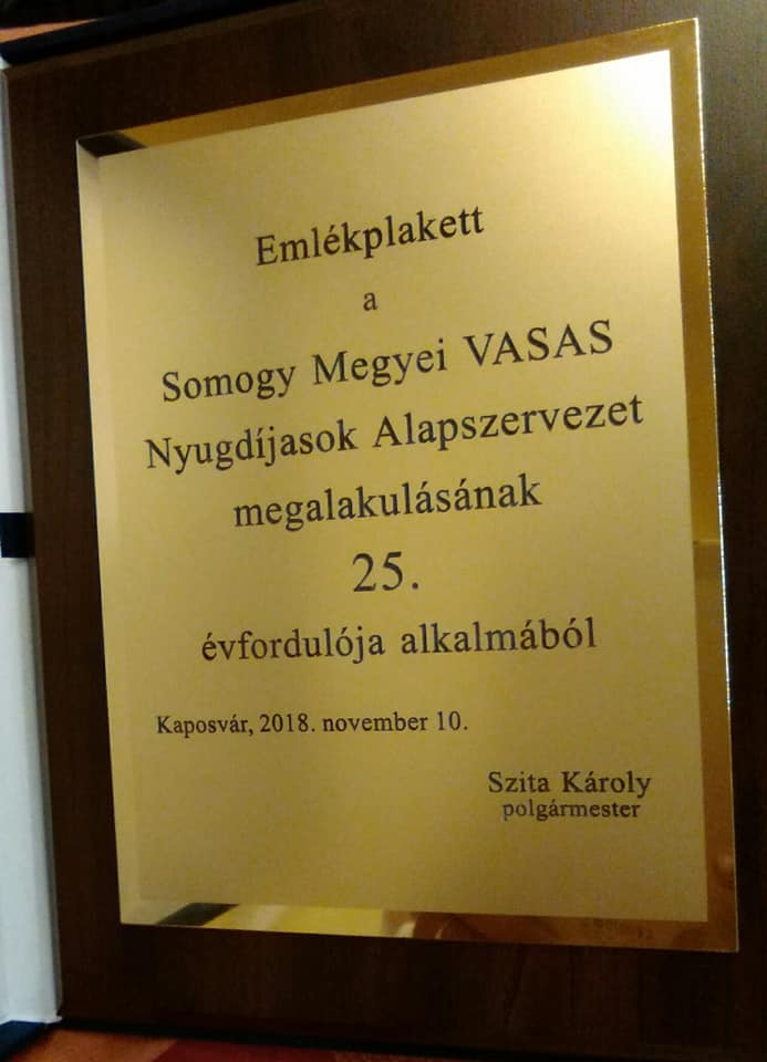 Megalakulásuk 25. évfordulója alkalmából ünnepi ülést tartottak a Somogy Megyei Vasas Nyugdíjas Alapszervezet tagjai. A vendégek között volt a város polgármestere Szita Károly is, aki ebből az alkalomból egy emlékplakettet készíttetett és adott át. Meghívottként jelen volt Hanfeldt István a Vasas Nyugdíjas Szervezet elnöke, Stikkel János a Somogy Megyei Nyugdíjas Szövetség elnöke, Svajda József a MASZSZ Somogy megyei képviselője, Battyányi Beáta civil- és roma referens, az önkormányzat részéről.