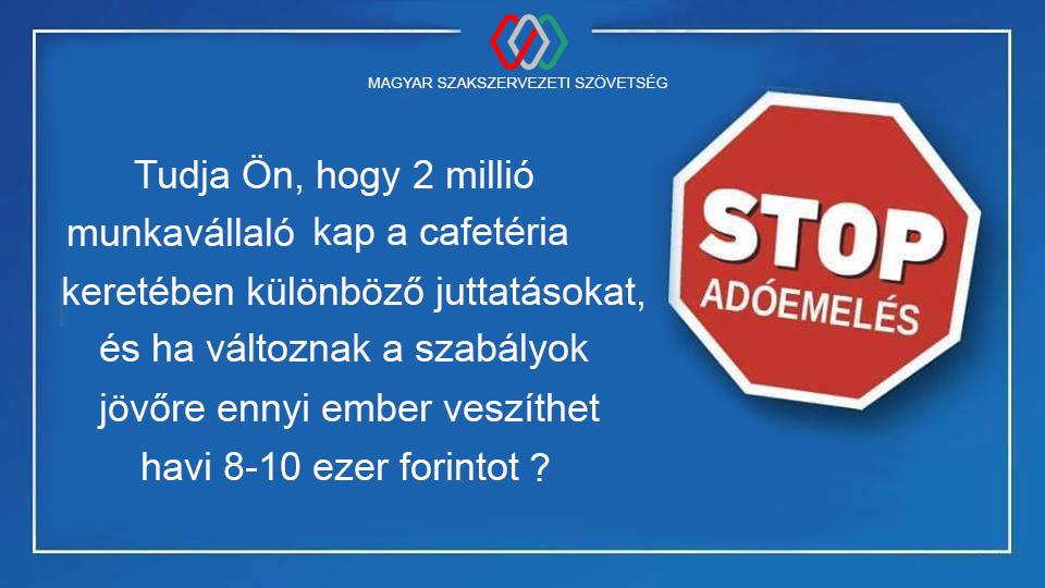 A Magyar Szakszervezeti Szövetség több munkavállalói szervezetet képviselve kereste meg a kormnányt, hogy a cafeteria bizonyos elemeit őrizzék meg. A Versenyszféra és a Kormány Állandó Konzultációs Fóruma, valamint az Országos Közszolgálati Érdekegyeztető Tanács munkavállalói oldalát alkotó szakszervezeti konföderációk  az egyes adótörvények és más kapcsolódó törvények módosításáról szóló törvénytervezettel kapcsoltban pénteken levelet intéztek a pénzügyminiszterhez.